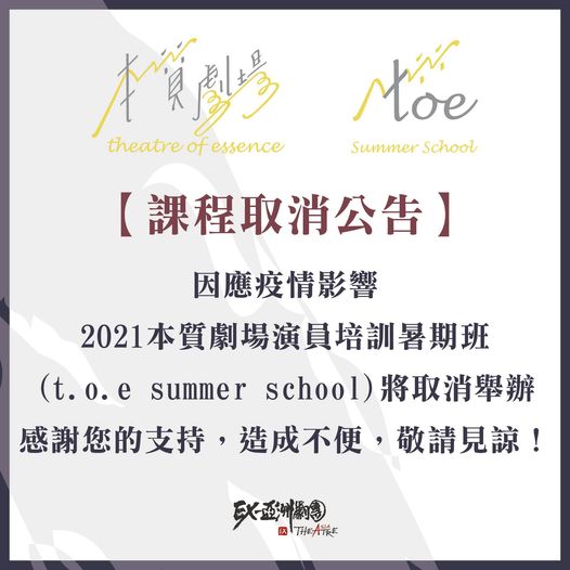 本質劇場演員培訓暑期班-課程取消公告 感謝各位夥伴們的支持及踴躍報名 因應疫情影響,今年的本質劇場演員培訓暑期班 (t.o.e summer school)將取消舉辦, 若造成您的不便,敬請見諒。 也感謝今年報名的夥伴們,以及支持、關心課程的朋友們, 為了守護彼此的健康,今年讓我們先攜手防疫, 也期許未來我們一同訓練、動身體的那天盡快到來!
