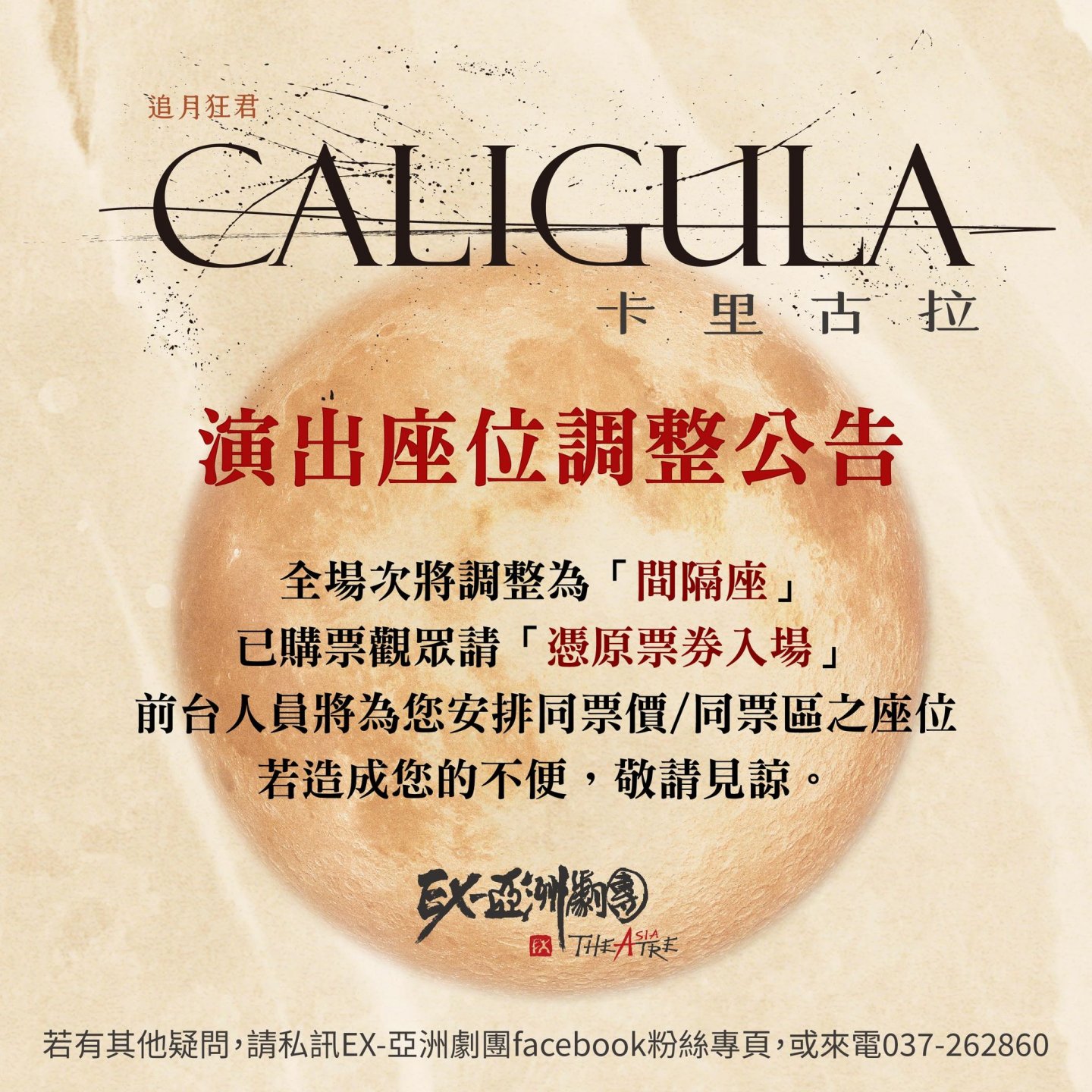 因應疫情升溫,EX-亞洲劇團為了讓觀眾朋友們有安心地看戲體驗,《追月狂君─卡里古拉》將調整為間隔座方式,調整方式如下: