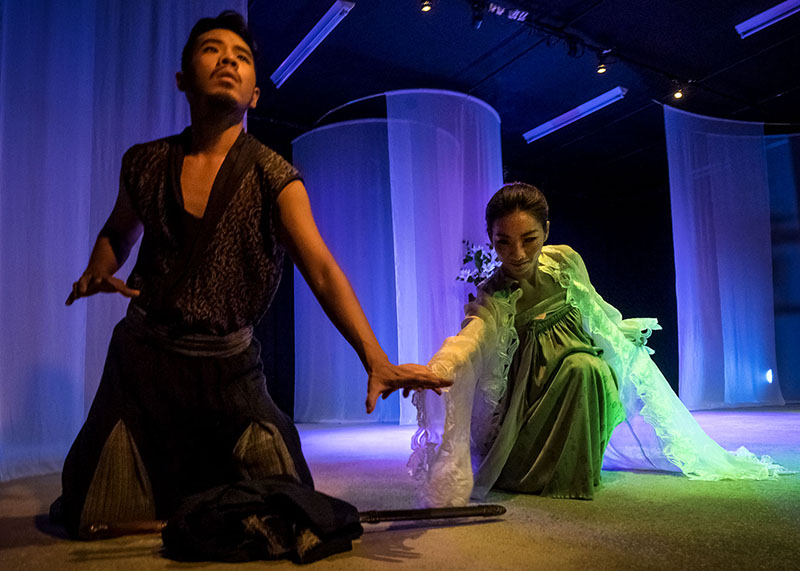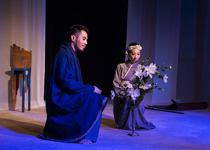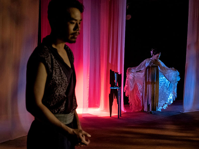 美國華裔劇作家黃哲倫之《聲外之音(THE SOUND OF A VOICE)》,一齣關於性別與權力的戲劇作品,故事圍繞著女人和日本武士這兩個主要角色。故事的內容主要是探討對於隱居的人們,如何和他人獲得一種「親密」關係?劇作本身以一種隱喻手法闡述社會對於兩性的價值觀。當人類面臨抉擇時,最後取決於內心的聲音還是社會的常規?故事內容為一位年邁的日本武士來到樹林一所深處,拜訪了一名獨自過著隱士般生活的神祕女人的家。到底這名男子是以「請求者」的身份而來?還是一名「刺客」?女子打算承認愛上他,還是像對待精心培養的花一般地永遠地監禁他?愛與能力的角力戰在這個故事裡成為一場致命的比賽,於是「英雄」和「懦夫」之間的界線開始變為模糊,在「勝利者」與「征服者」之間又該如何區別?在當今男女平權意識抬頭的現今社會,《聲外之音》提供了另一種觀點。
